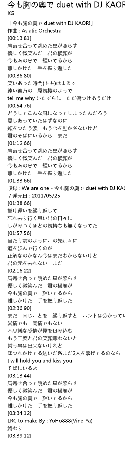 | [00:01.81] | 「今も胸の奥で duet with DJ KAORI」 |