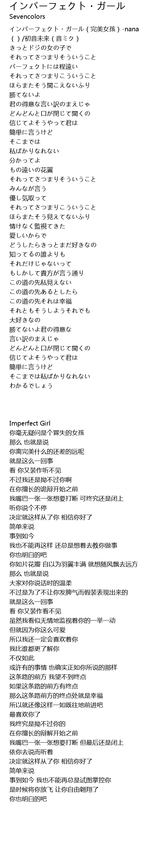 | [00:00.00] | インパーフェクト・ガール(完美女孩)-nana ()/初音未来(音ミク) |