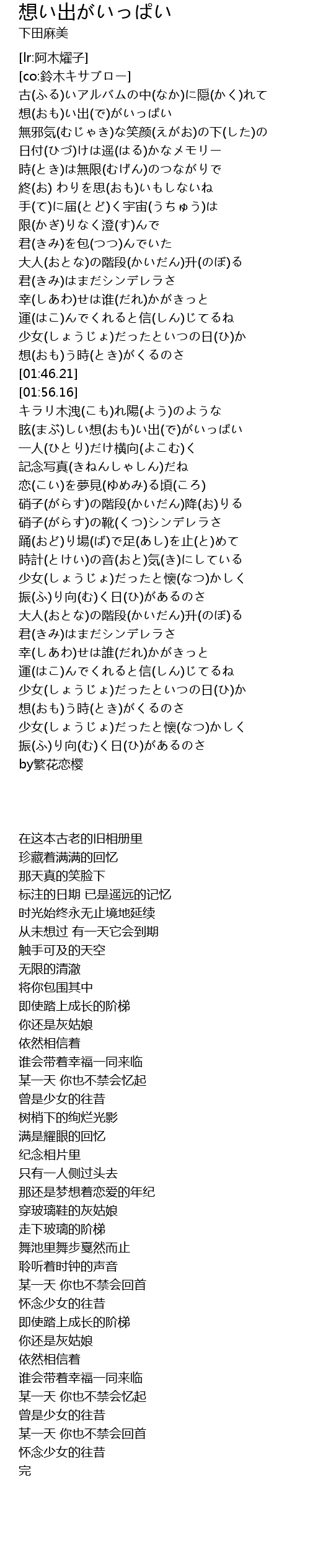 | [00:30.35] | 想(おも)い出(で)がいっぱい |