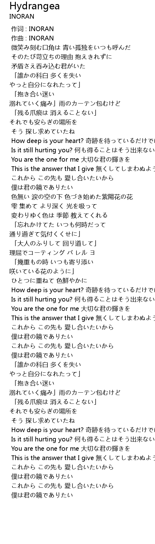 | [02:12.069] | 色無い 涙の空の下 色づき始めた紫陽花の花 |