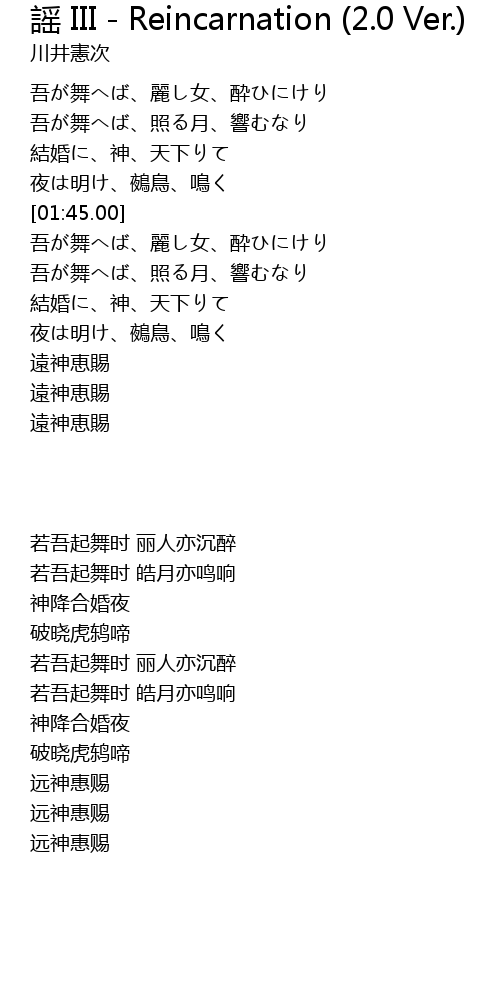 | [00:50.35] | 吾が舞へば、照る月、響むなり |