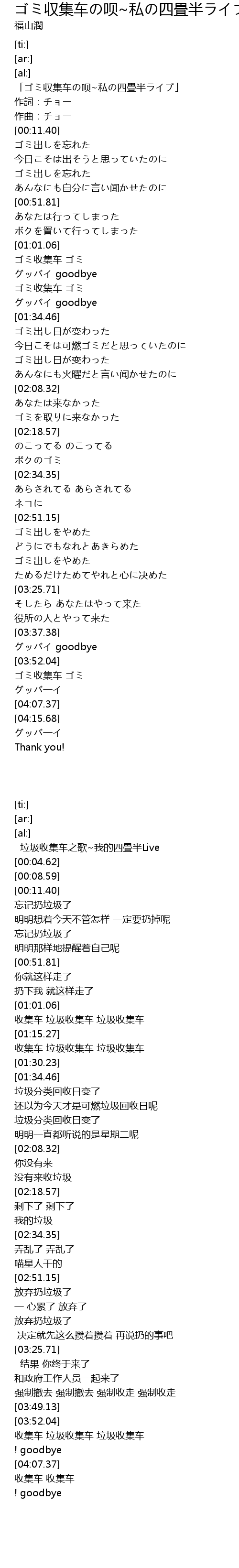 | [00:02.47] | 「ゴミ収集车の呗~私の四畳半ライブ」 |