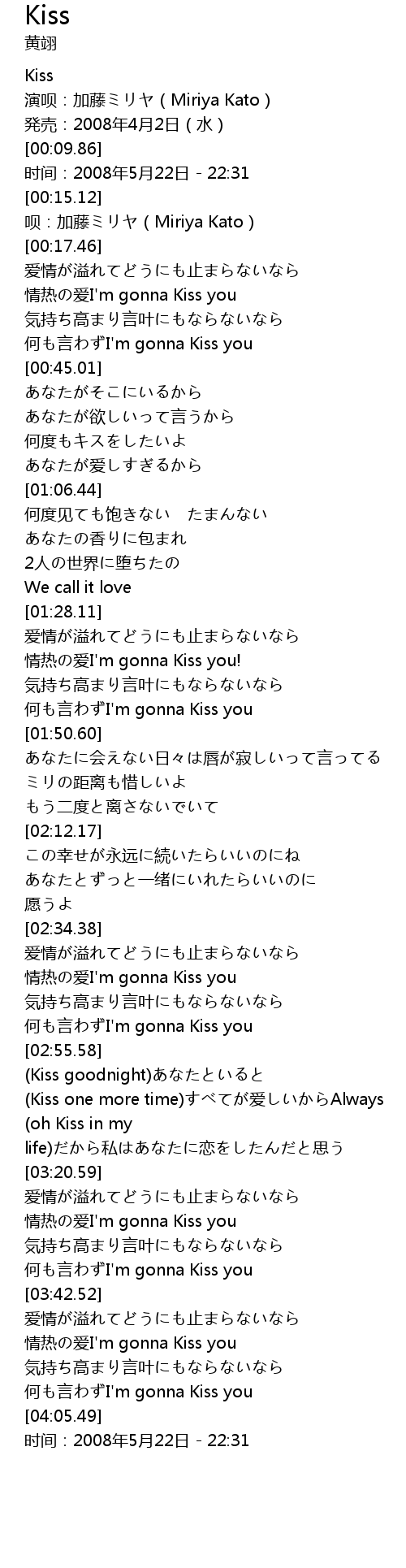| [00:39.64] | 何も言わずI'm gonna Kiss you |