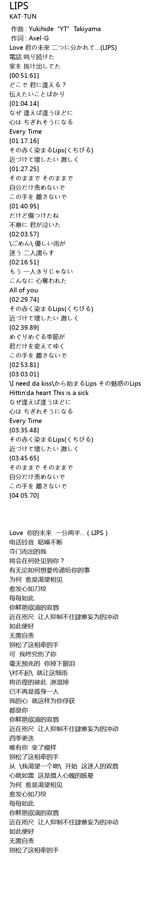 | [03:16.39] | I need da kiss shǐ Lips mèi huò Lips |