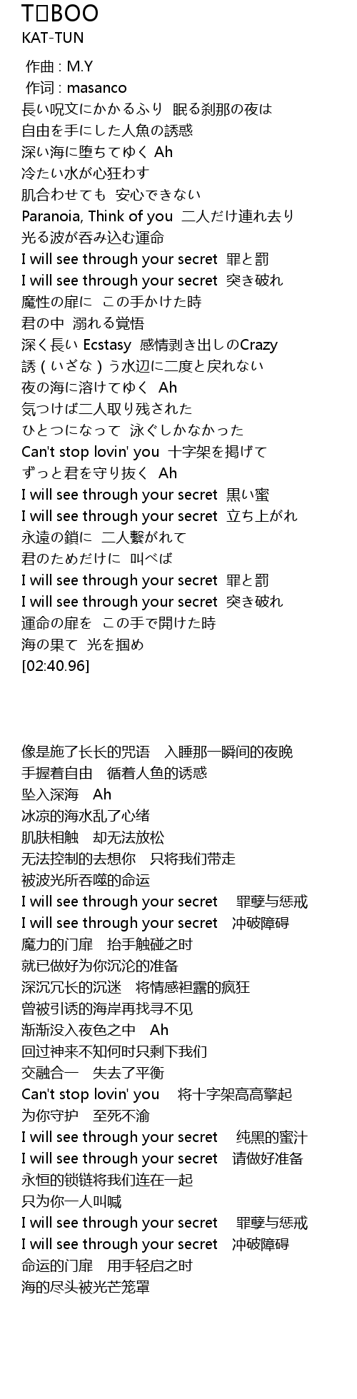 | [02:27.14] | I will see through your secret tu po |