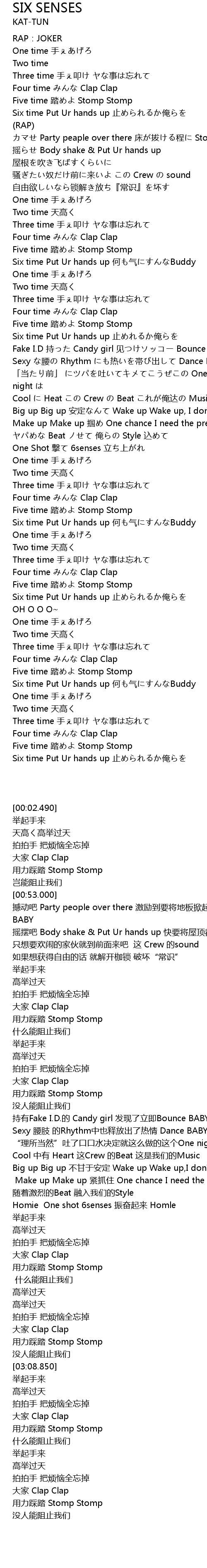 | [01:51.000] | Six time Put Ur hands up 止めれるか俺らを |
