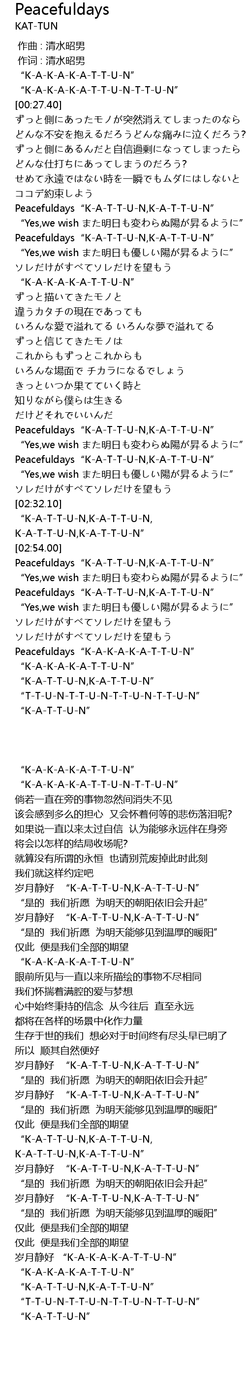 | [03:24.80] | Peacefuldays" KATTUN, KATTUN" |