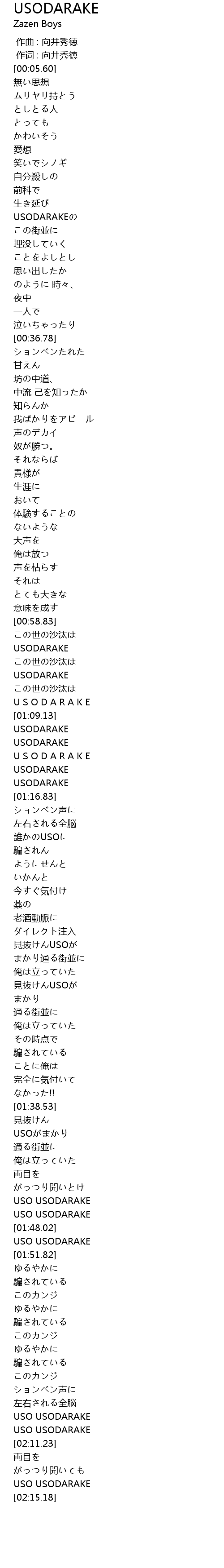 | [01:48.54] | USO USODARAKE |