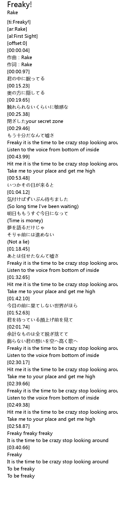 | [00:35.29] | Freaky it is the time to be crazy stop looking around |