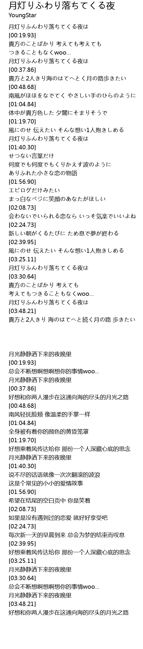 | [03:48.75] | 貴方と2人きり 海のはてへと続く月の路 歩きたい |