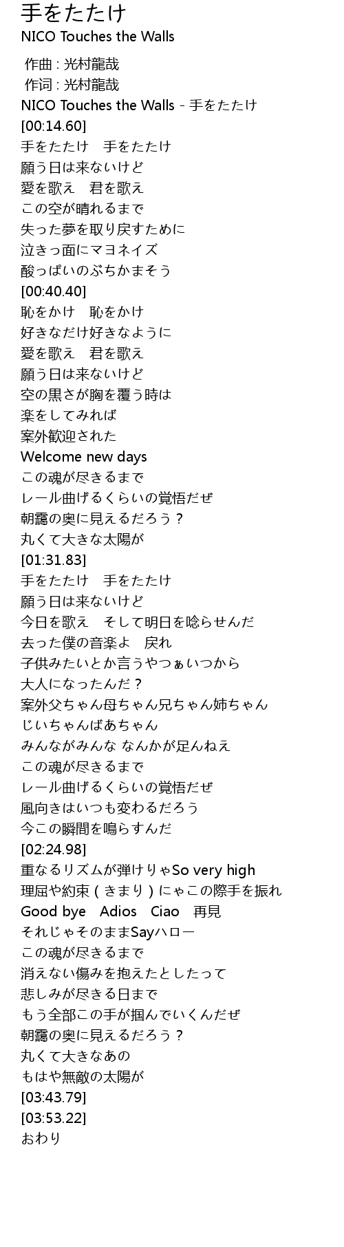 | [00:00.00] | NICO Touches the Walls - 手をたたけ |