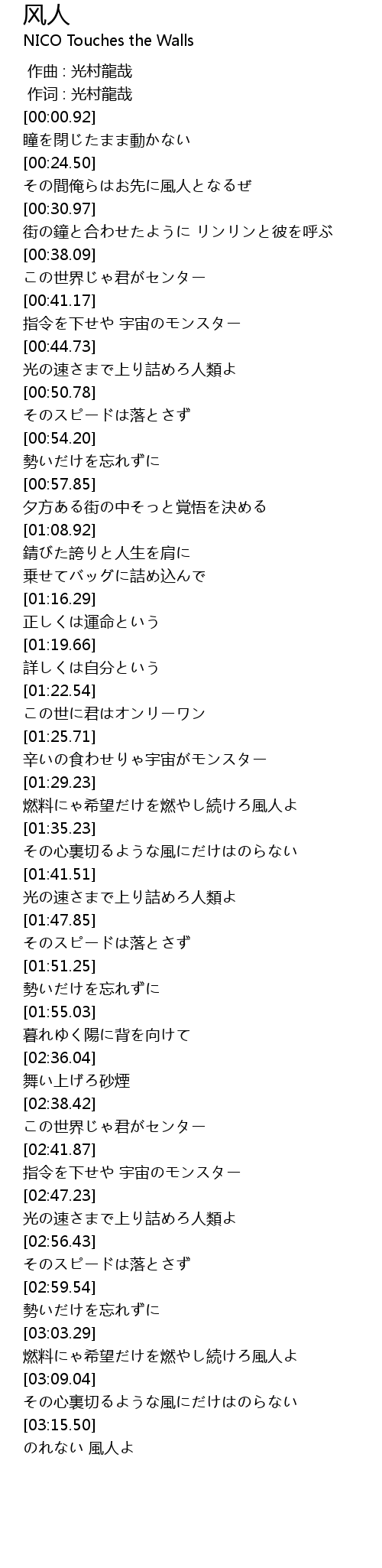 | [03:03.84] | 燃料にゃ希望だけを燃やし続けろ風人よ |