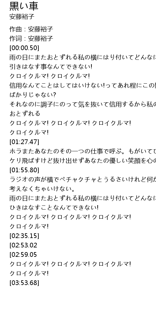 | [00:42.94] | クロイクルマ! クロイクルマ! |