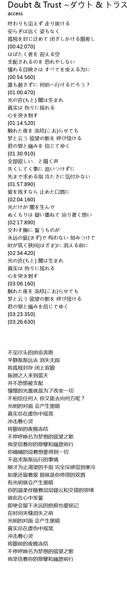 | [01:26.860] | 君の罪と痛みを 信じてゆく |