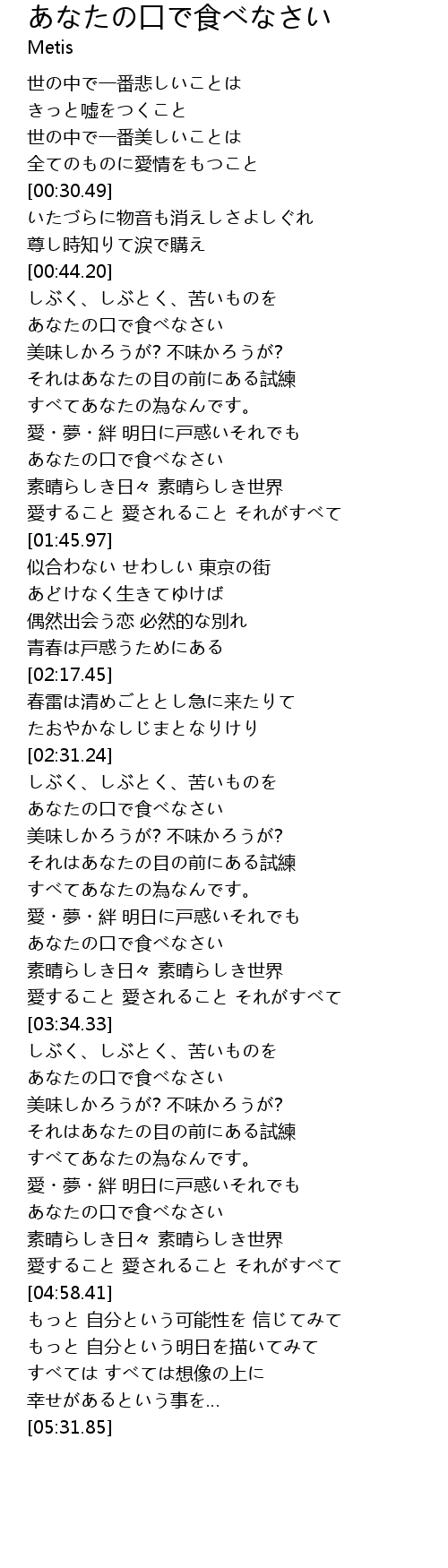 | [04:09.90] | 美味しかろうが? 不味かろうが? |