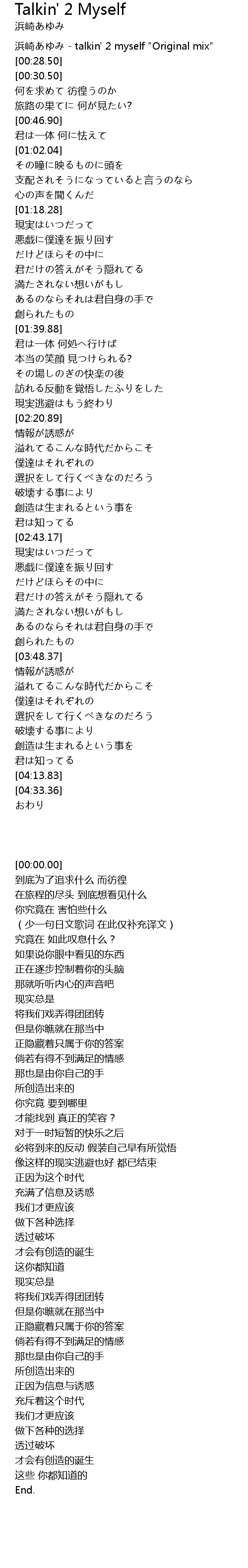 | [00:00.00] | 浜崎あゆみ - talkin' 2 myself "Original mix" |