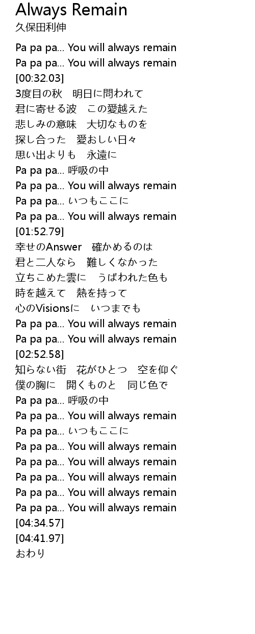| [02:43.71] | Pa pa pa... You will always remain |