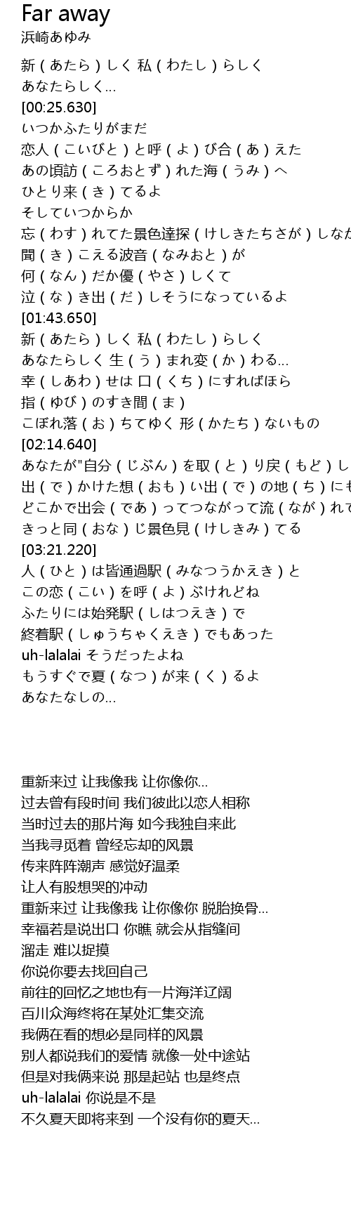 | [01:29.610] | 聞(き)こえる波音(なみおと)が 何(なん)だか優(やさ)しくて |