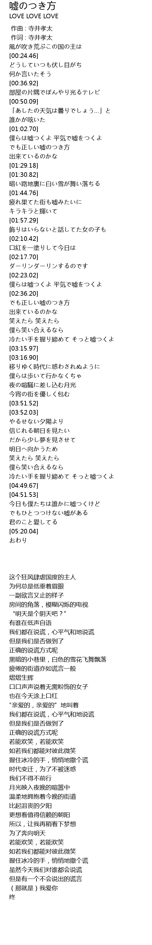 | [02:23.53] | 僕らは嘘つくよ 平気で嘘をつくよ |
