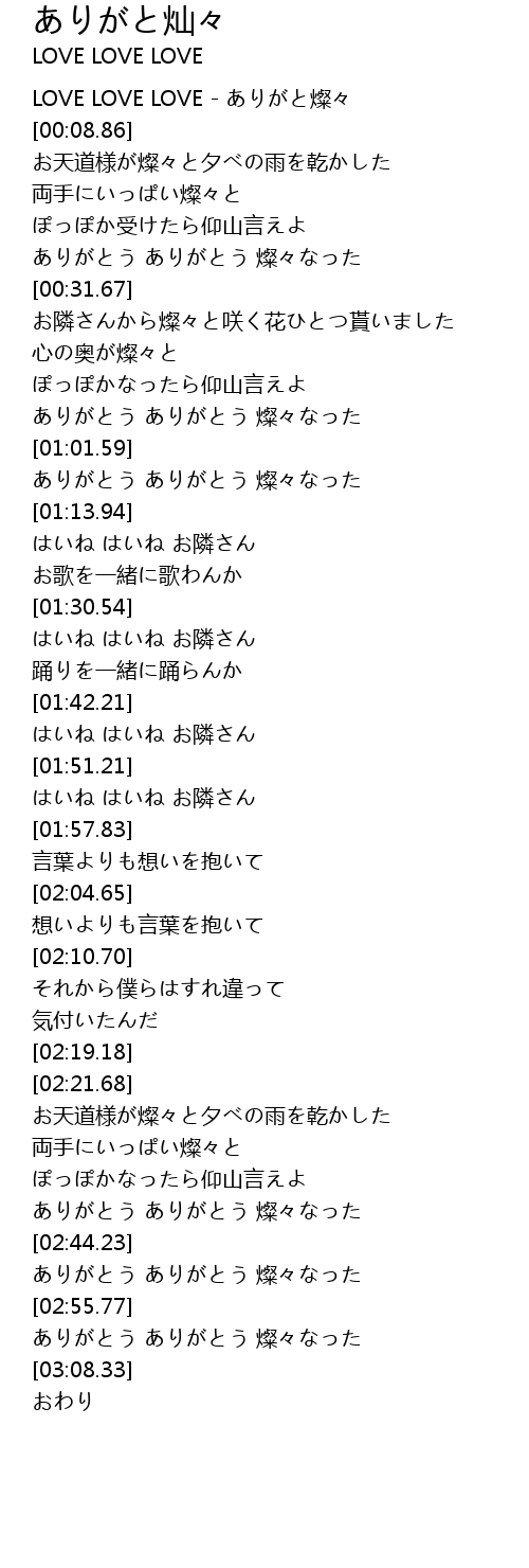 | [00:00.18] | LOVE LOVE LOVE - ありがと燦々 |