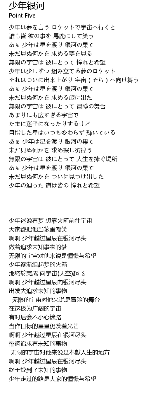| [00:47.29] | shào nián xīng dù yín hé guǒ |