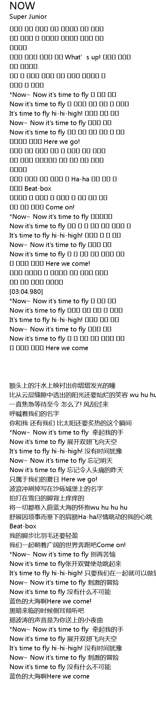 | [03:08.350] | *Now~ Now it's time to fly 내 손을 잡아 |