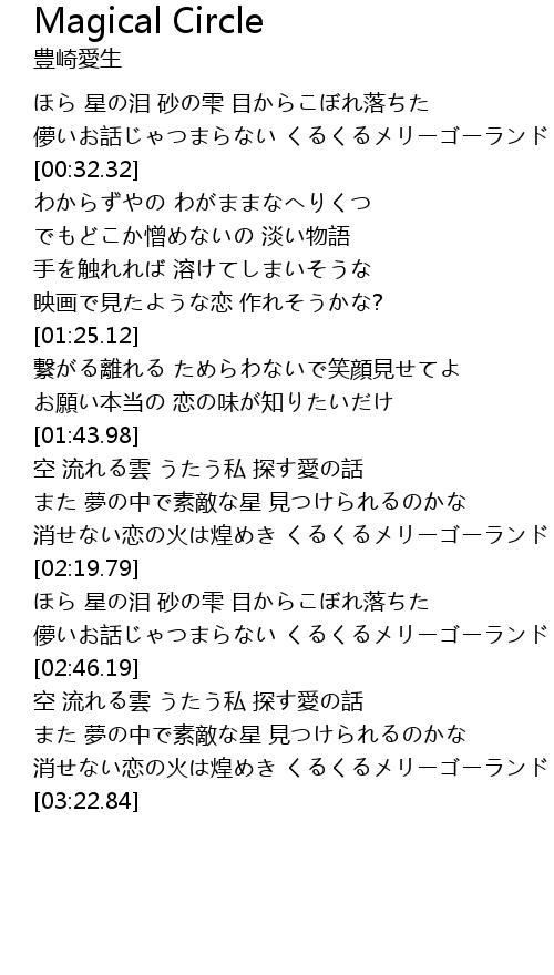 | [00:23.57] | 儚いお話じゃつまらない くるくるメリーゴーランド |