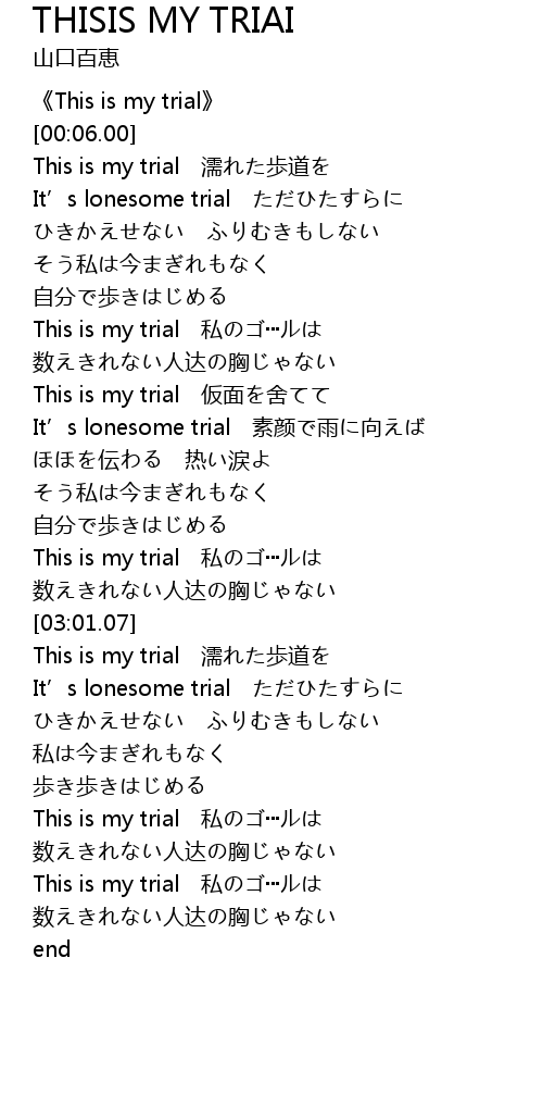 | [00:15.61] | This is my trial 濡れた歩道を |