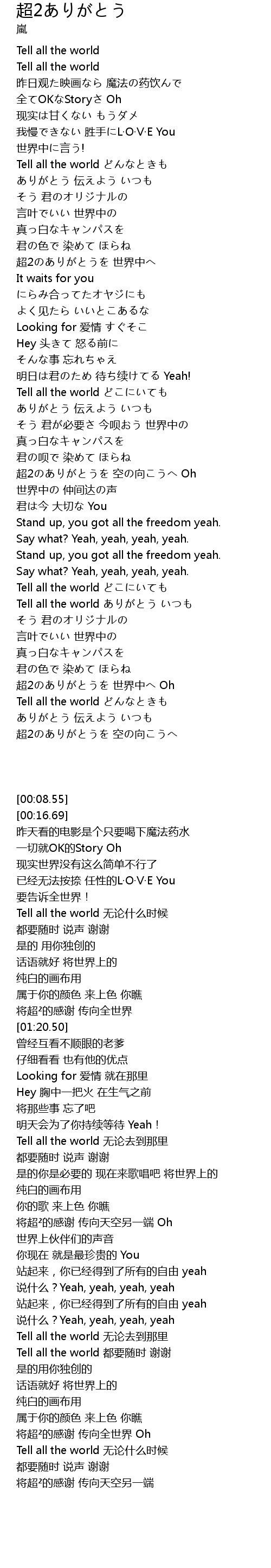 | [03:38.99] | 超2のありがとうを 世界中へ Oh |