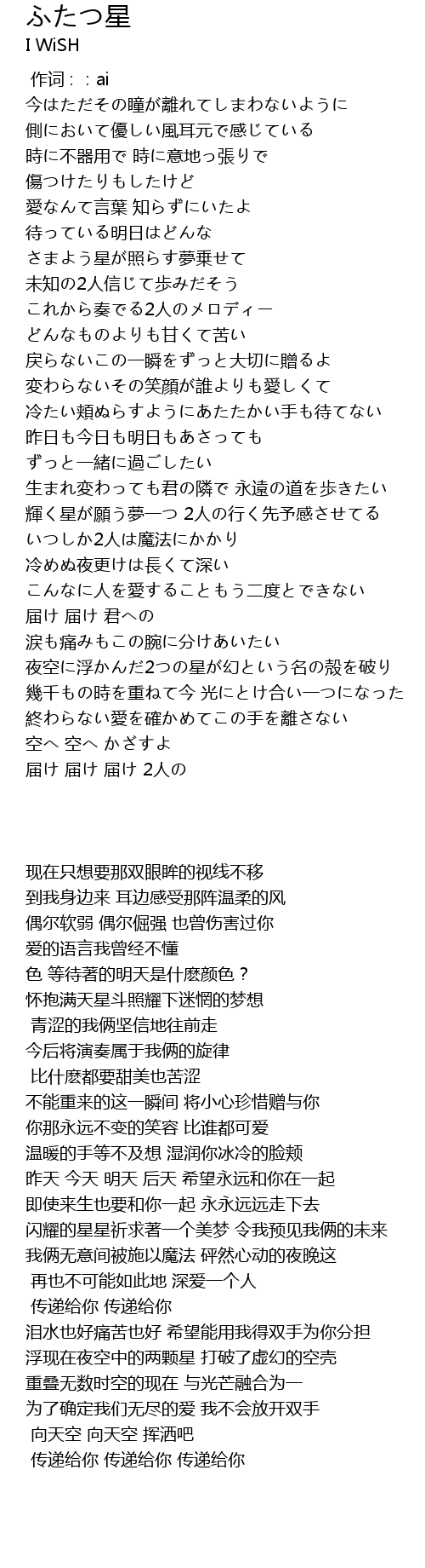 | [02:32.030] | 輝く星が願う夢一つ 2人の行く先予感させてる |