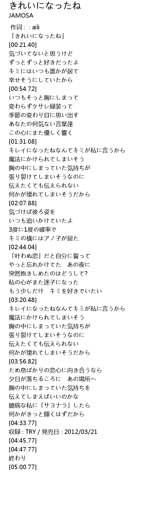 | [03:21.12] | キレイになったねなんてキミが私に言うから |