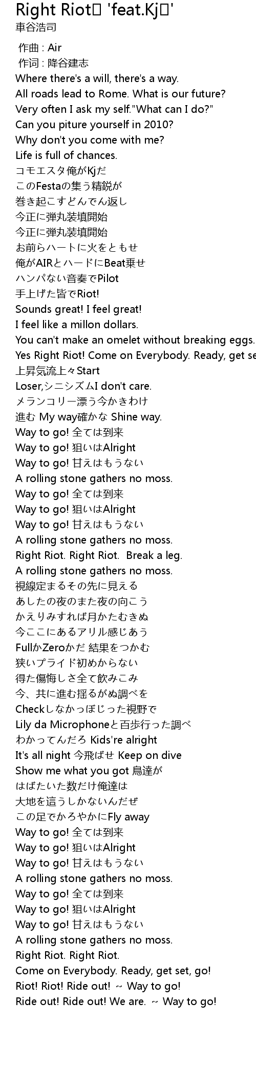 | [03:17.19] | Riot! Riot! Ride out! ~ Way to go! |