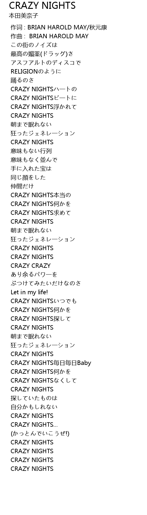 | [01:32.762] | CRAZY NIGHTS求めて |