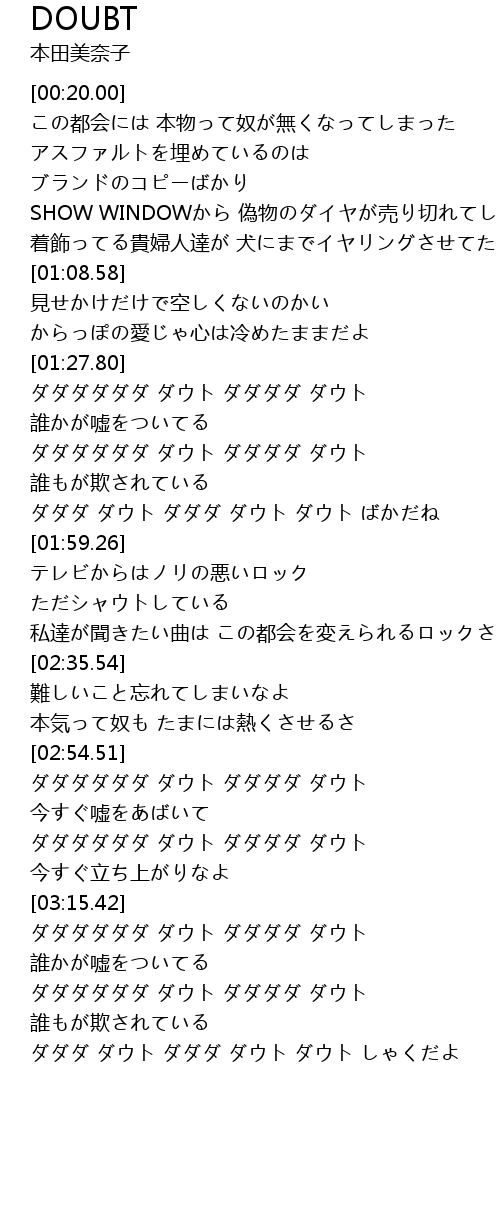 | [03:38.51] | ダダダダダダ ダウト ダダダダ ダウト 誰もが欺されている |