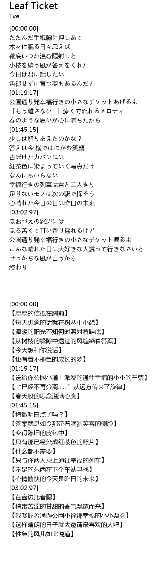 | [01:20.46] | 公園通り発幸福行きの小さなチケットあげるよ |