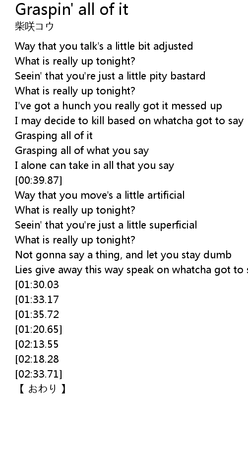 | [01:43.41][01:33.17][01:12.97] | Grasping all of what you say |
