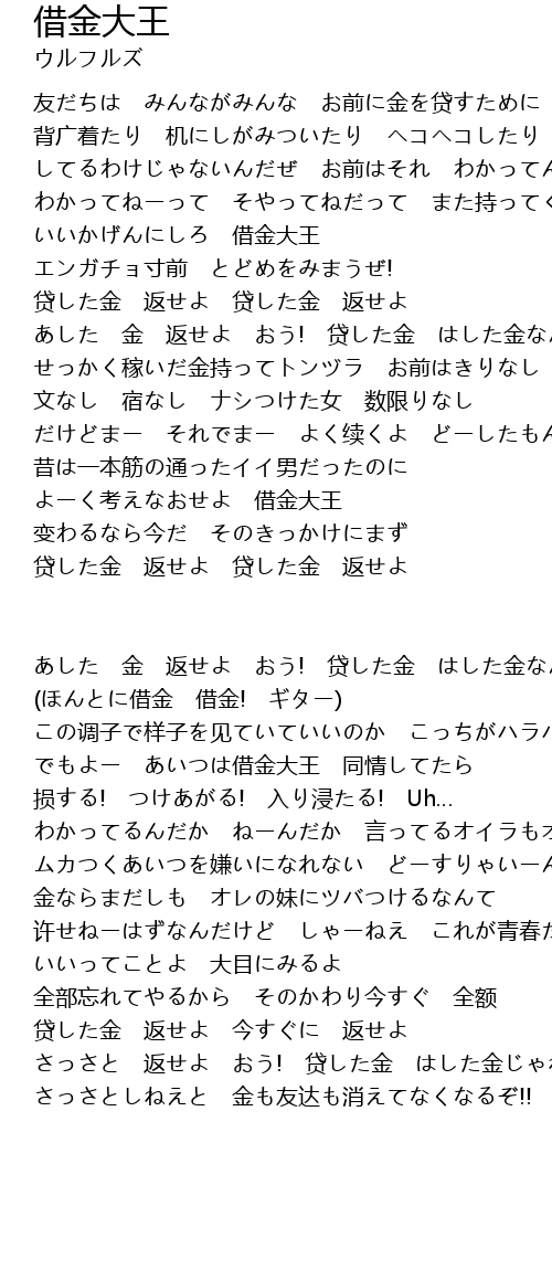 | 贷した金 返せよ 今すぐに 返せよ | |