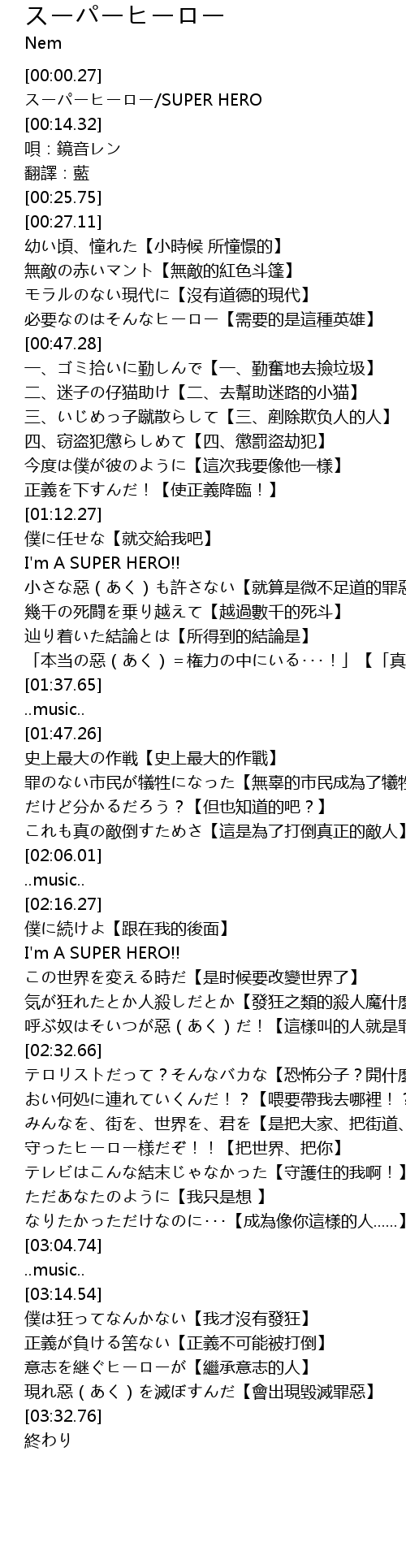 | [00:01.14] | スーパーヒーロー/SUPER HERO |