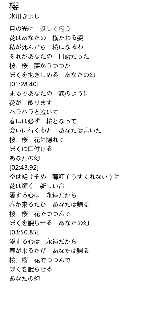 | [03:28.54] | 桜、桜 花でつつんで |
