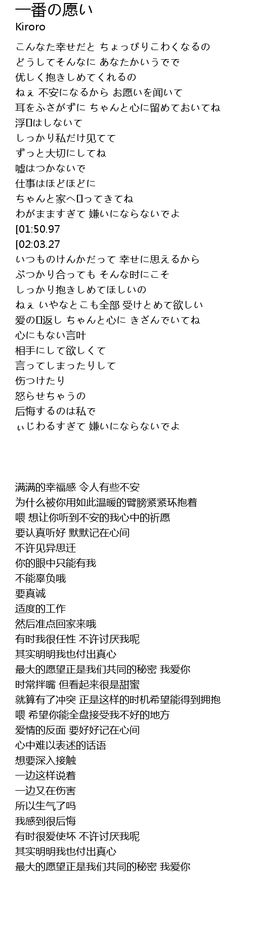 | [04:17.53][02:03.27] | 一番の愿いは 二人の秘密 I LOVE YOU |