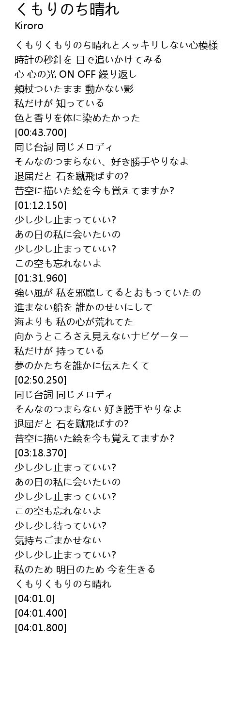 | [00:00.490] | くもりくもりのち晴れとスッキリしない心模様 |