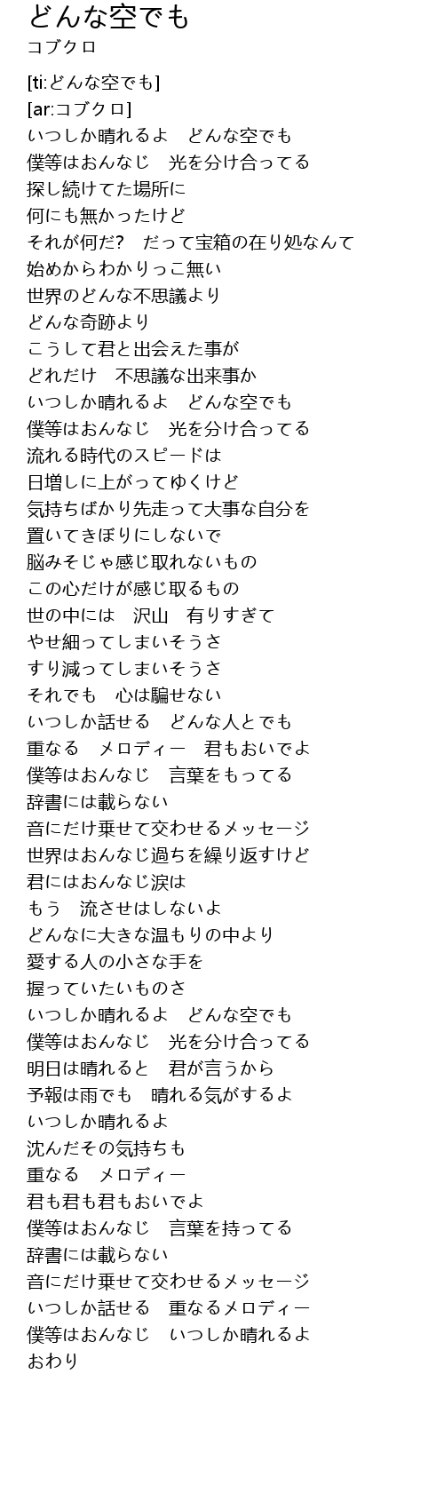 | [04:03.61] | 僕等はおんなじ 光を分け合ってる |