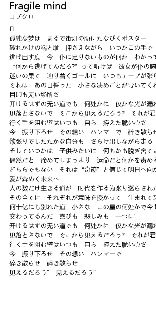 | 行く手を阻む壁はいつも 自ら 拵えた脆い心さ | |