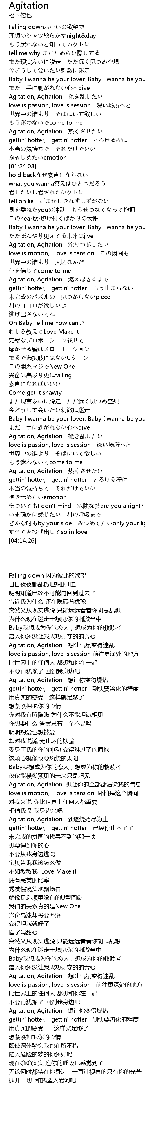 | [01:04.15] | Agitation, Agitation 热くさせたい |
