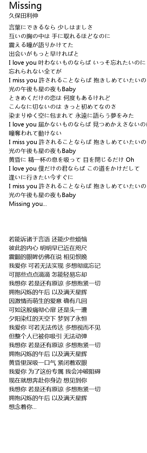 | [02:37.390] | I miss you 許されることならば 抱きしめていたいのさ |