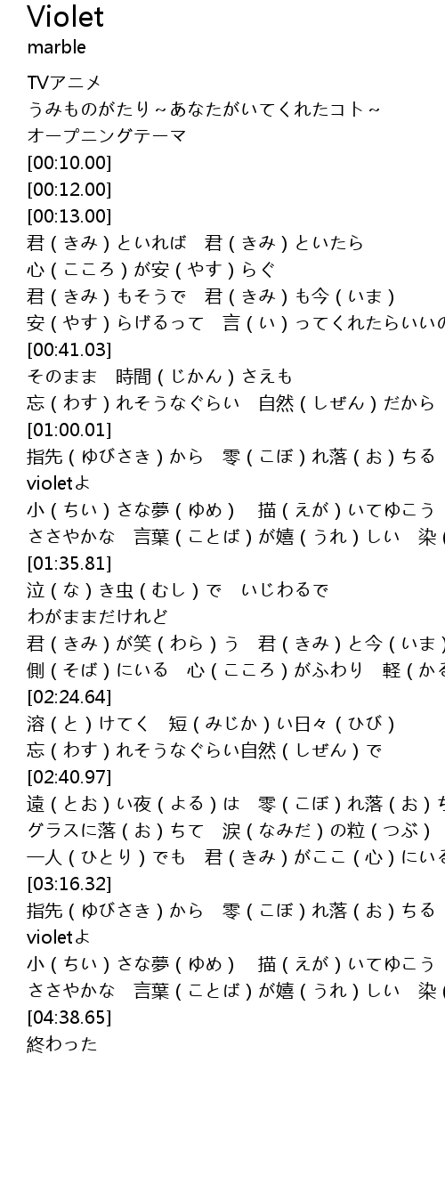 | [04:04.01] | 指先(ゆびさき)から 零(こぼ)れ落(お)ちる violetよ |