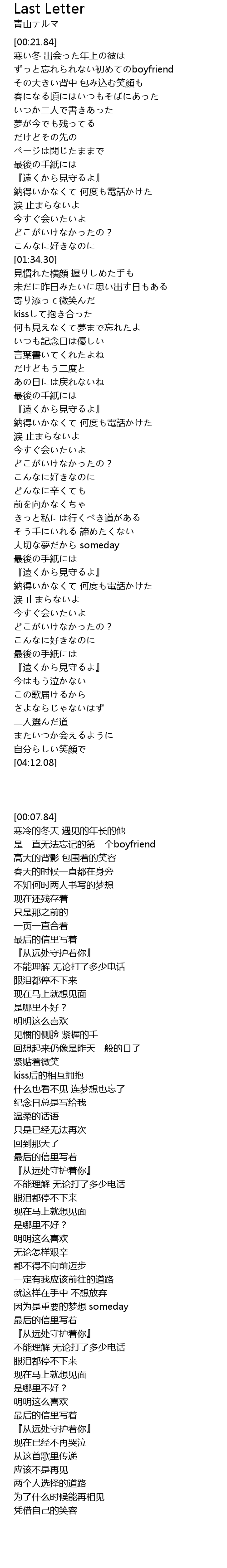 | [01:45.37] | 見慣れた横顔 握りしめた手も |