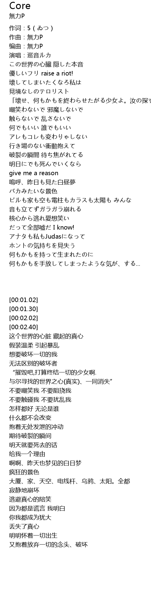 | [00:20.46] | 「壊せ、何もかもを終わらせたがる少女よ。汝の探す世界の核(真実)は、汝と共に滅びる」 |