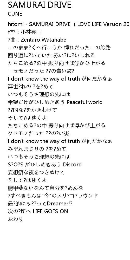 | [00:00.00] | hitomi - SAMURAI DRIVE (LOVE LIFE Version 2005) |