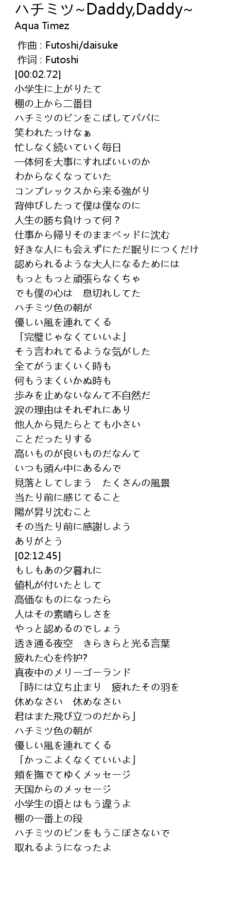 | [04:05.11] | ハチミツのビンをもうこぼさないで |